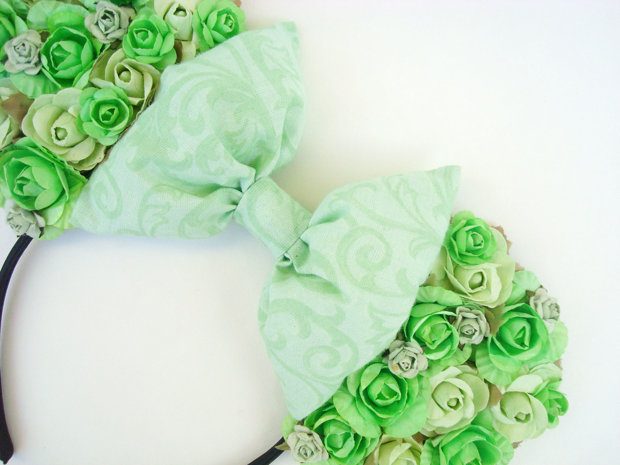 Handmade floral ears made with green & mint colored rosettes, leaves & adorn with a lovely mint bow♡