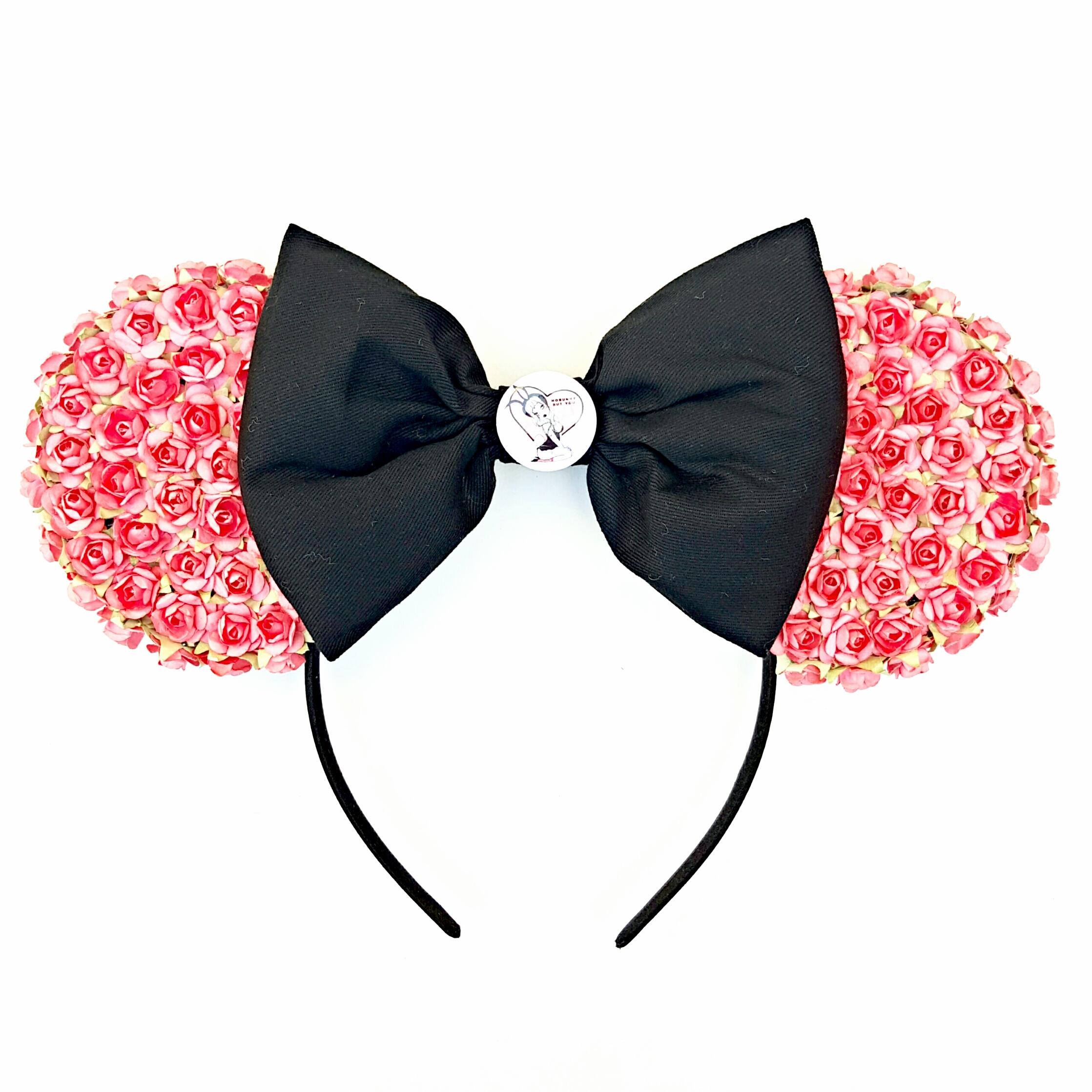 Handmade floral ears made with coral pink colored rosettes, leaves & adorn with a lovely black bow with a pin featuring a drawing by Ilse Valfres♡