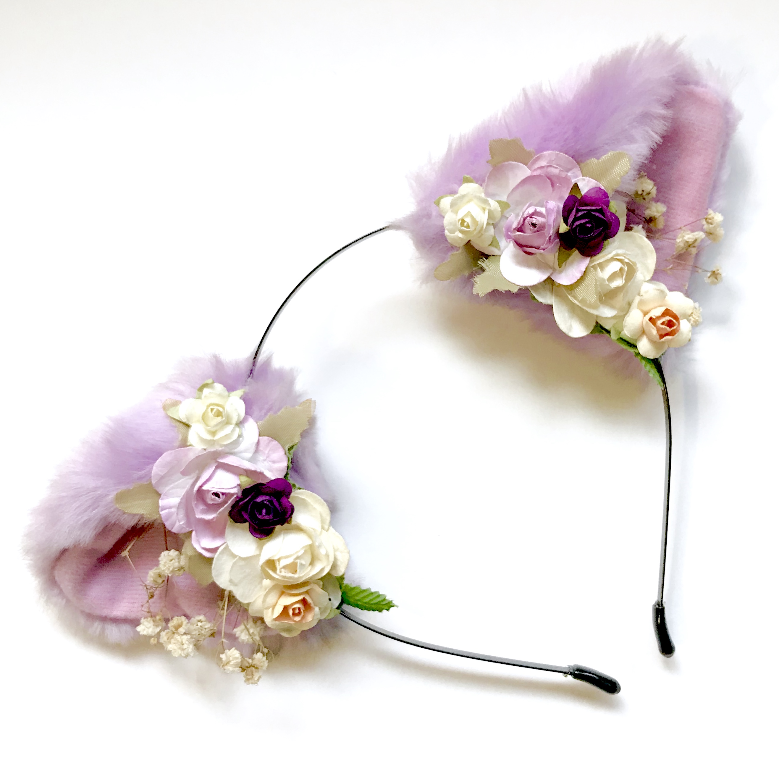 Handmade ears made with soft lilac fur, pink fabric & adorn with lilac ombre, peach, cream & purple colored rosettes & dried Baby's Breath for a lovely finish♡