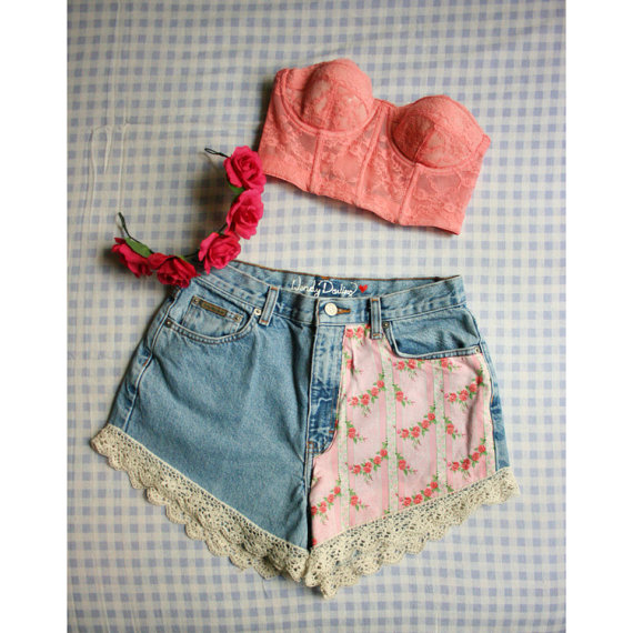 High waisted jeans altered into shorts made with a floral panel sown onto the right side & cream colored lace ends for a lovely end finish detailing♡