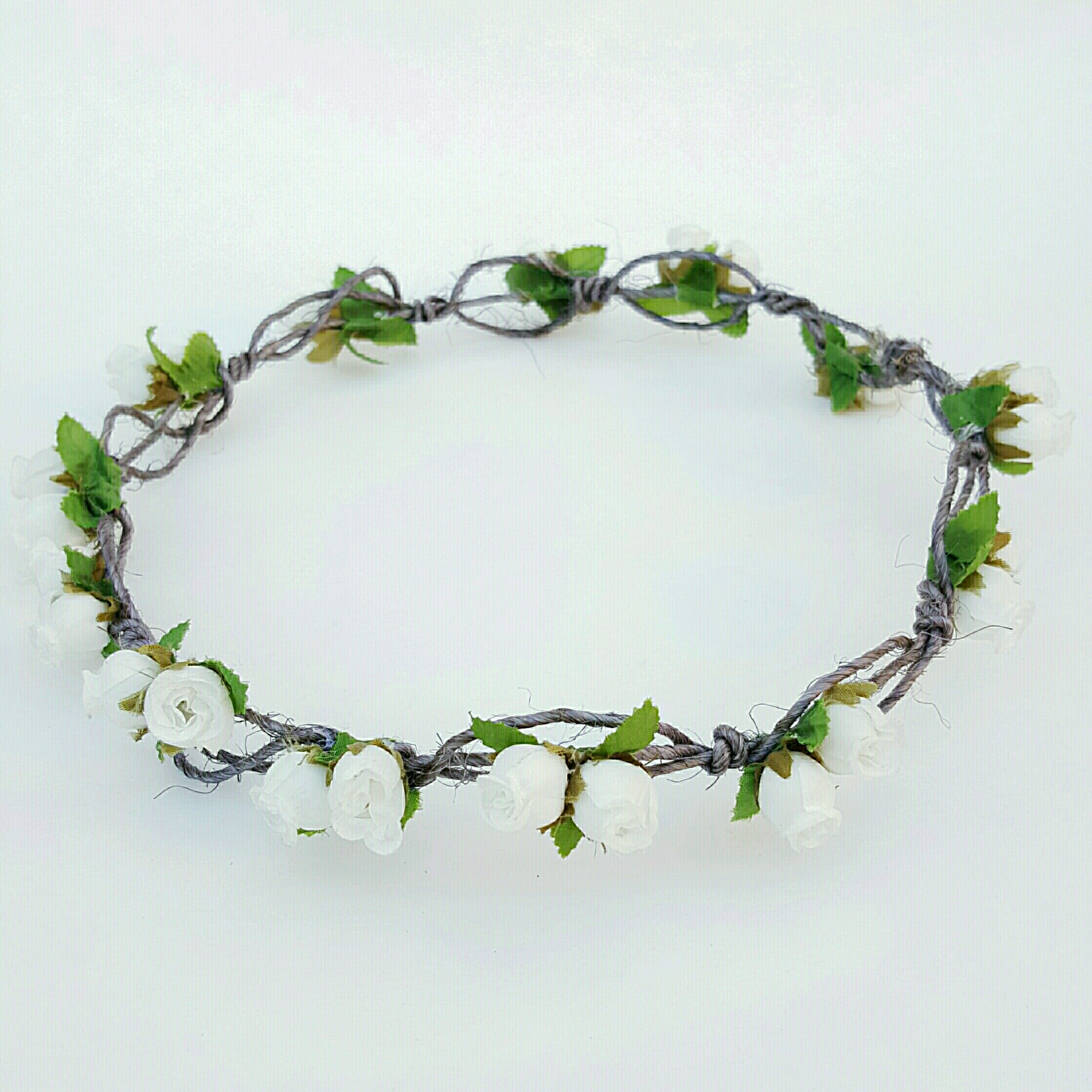 Handmade floral crown made with white colored rosette belles, leaves, wreaths, leaves, vines & lovely finish detailing♡