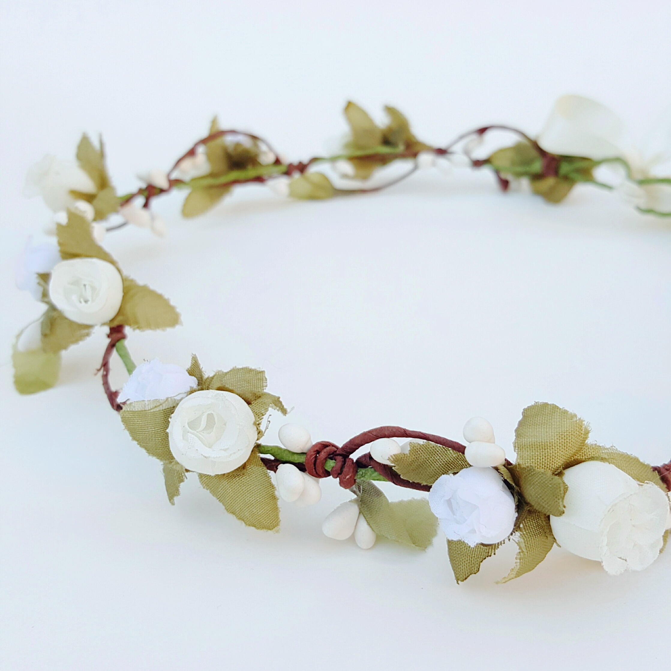 Handmade floral crown made with white colored rosette belles, wreaths, leaves, vines & lovely finish detailing♡
