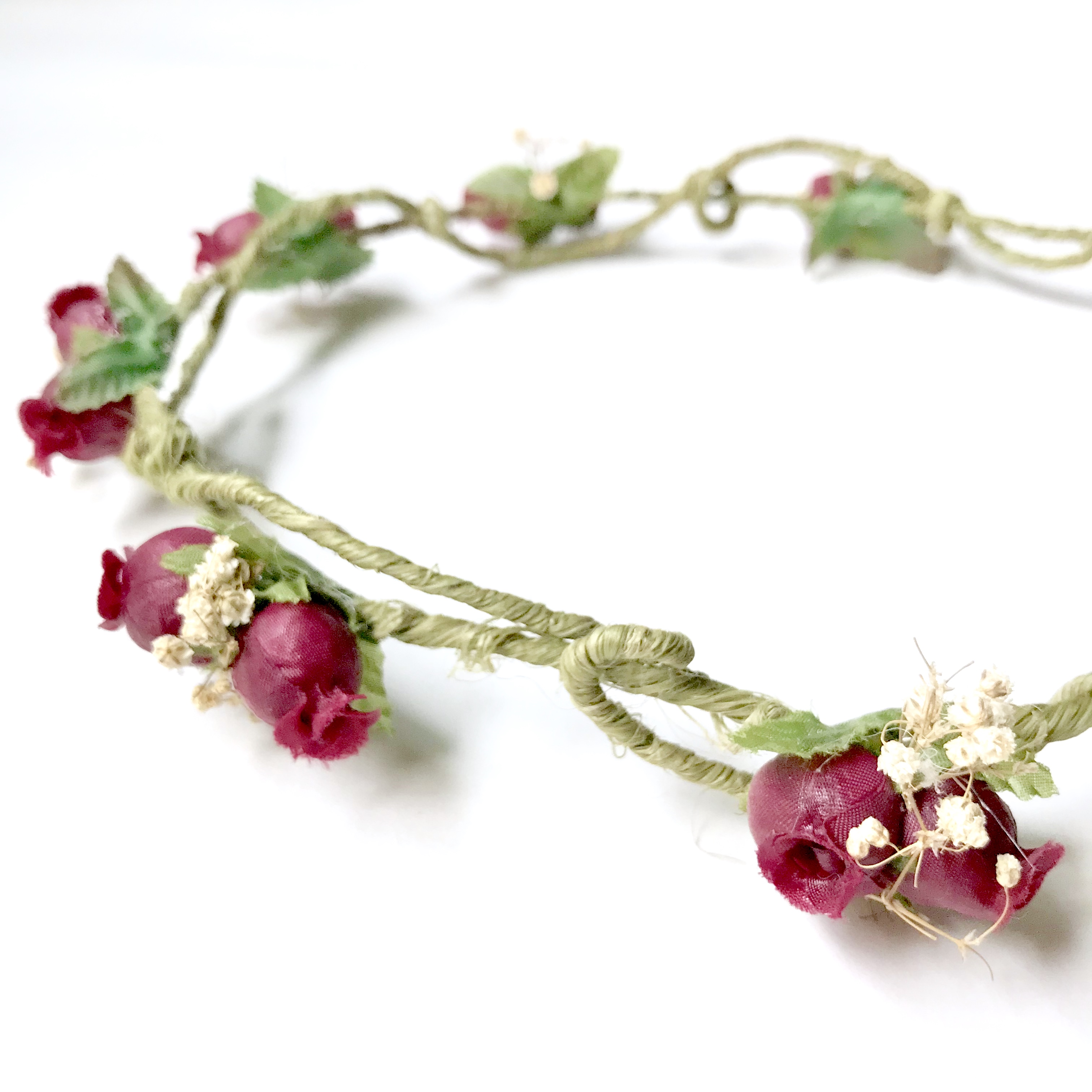 Handmade floral crown made with maroon colored silk rosette belles, wreaths, leaves, vines & real Baby's Breath finish detailing♡