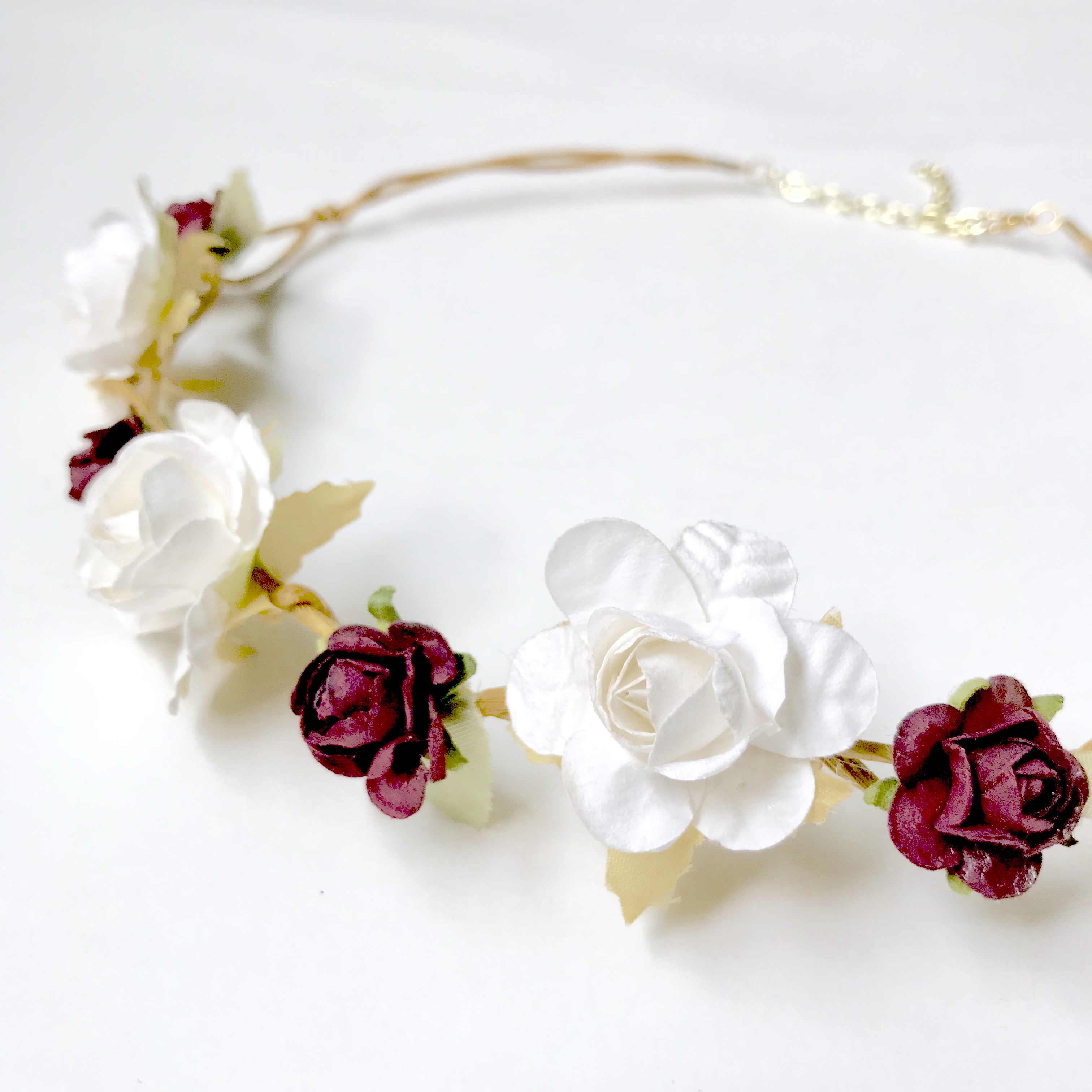 Handmade floral crown made with white & burgundy colored rosettes, wreaths, leaves, vines & lovely finish detailing♡