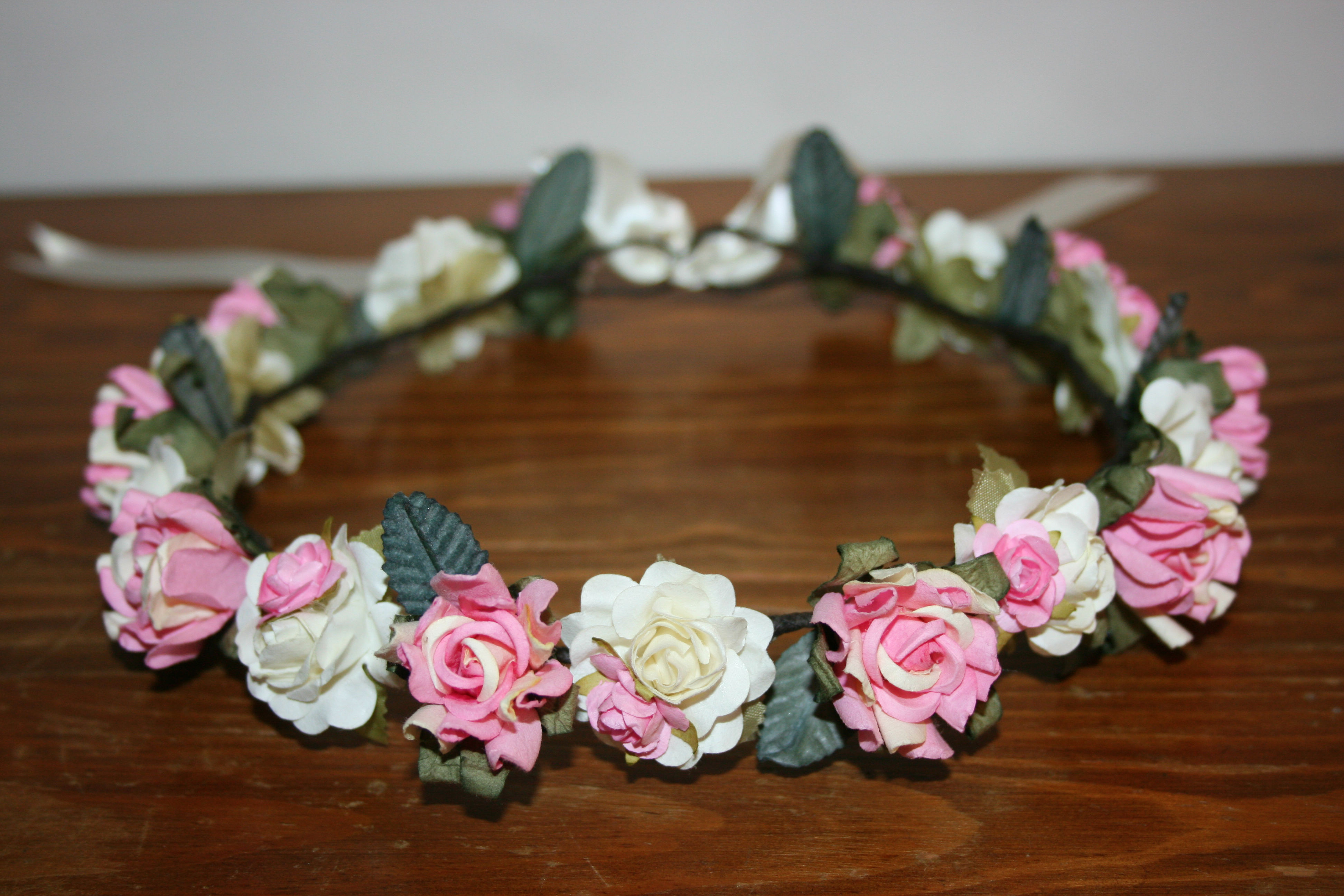 Handmade floral crown made with ombre pink, cream & pink colored rosettes, wreaths, leaves, vines & lovely finish detailing♡