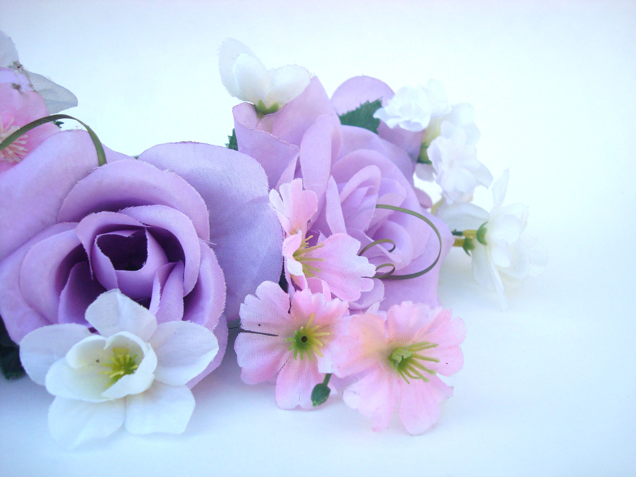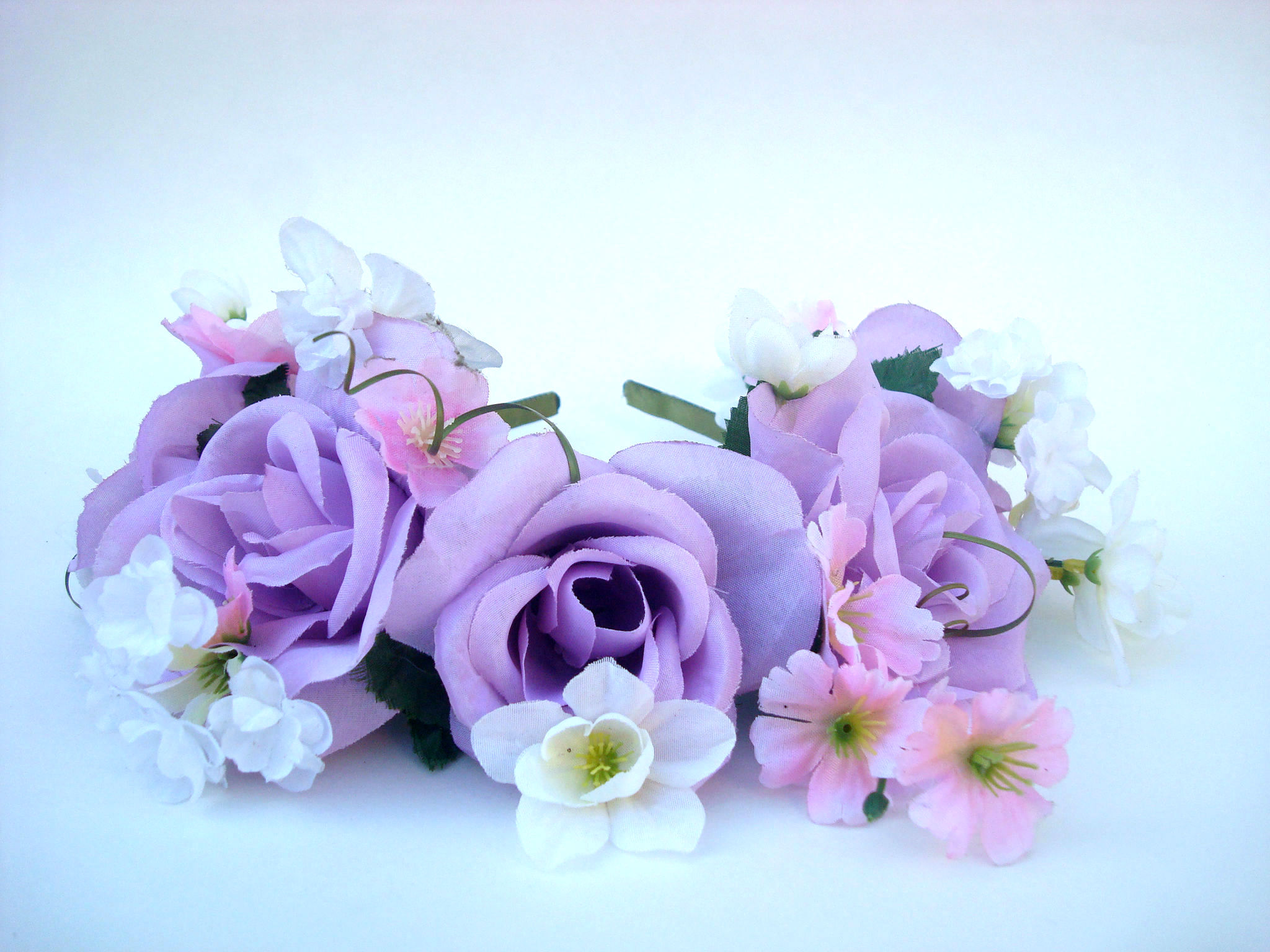 Handmade floral headband made with lilac, pink & white colored silk rosettes, leaves, vines & lovely finish detailing♡