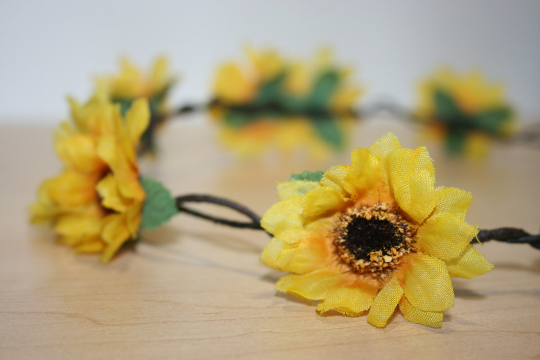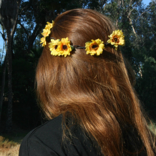 Handmade floral crown made with bright yellow colored silk sunflowers, wreaths, leaves & lovely finish detailing♡