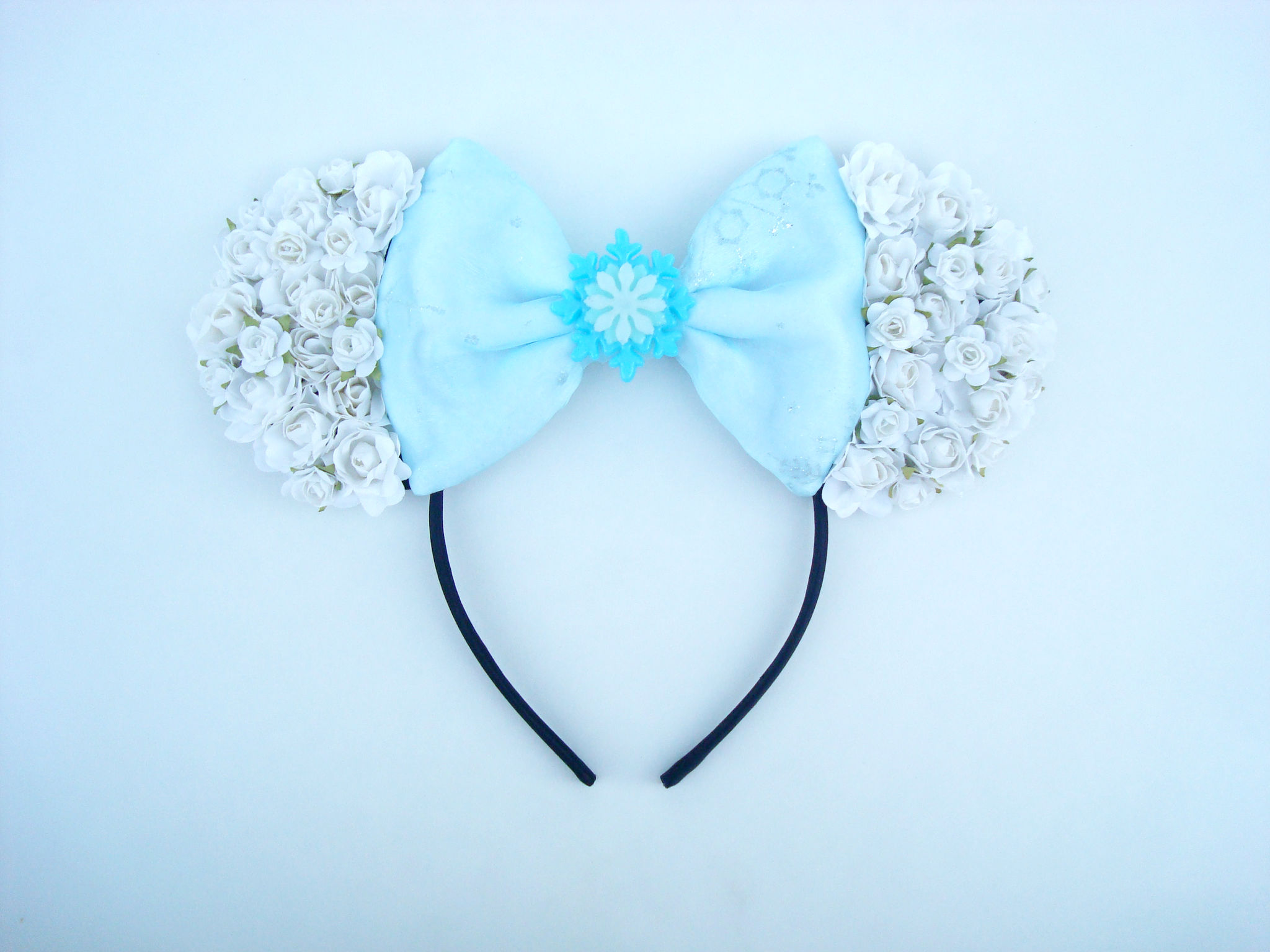 Handmade floral ears made with white colored rosettes, leaves, adorn with a double layered blue chiffon bow & finished with a snowflake center piece♡