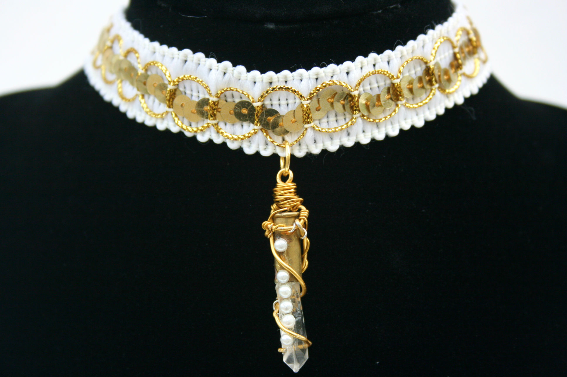 Handmade crystal choker made with a wire wrapped Clear Quartz bullet pendant attached to an ivory lace choker, adorn with gold trim detail♡
