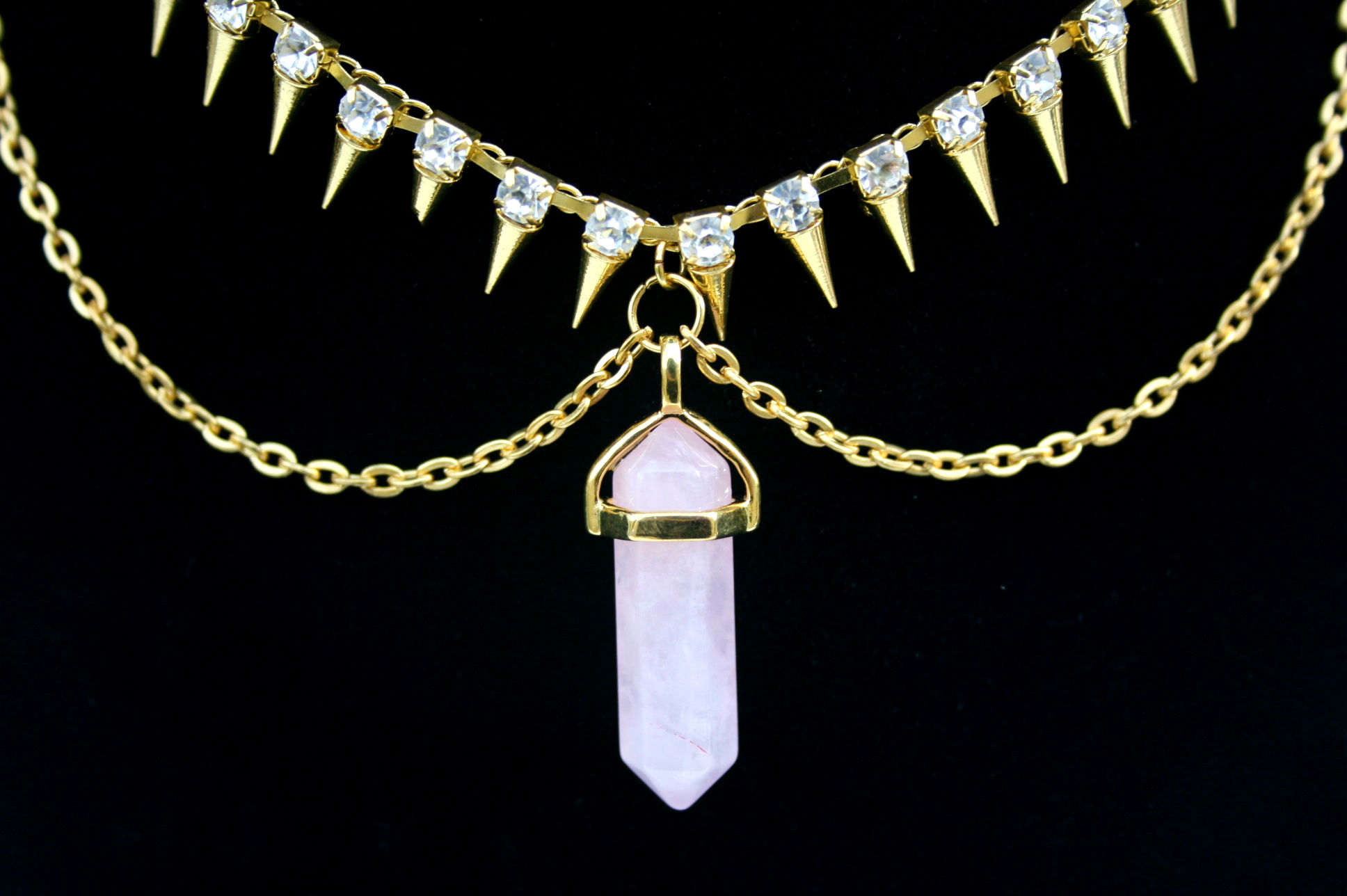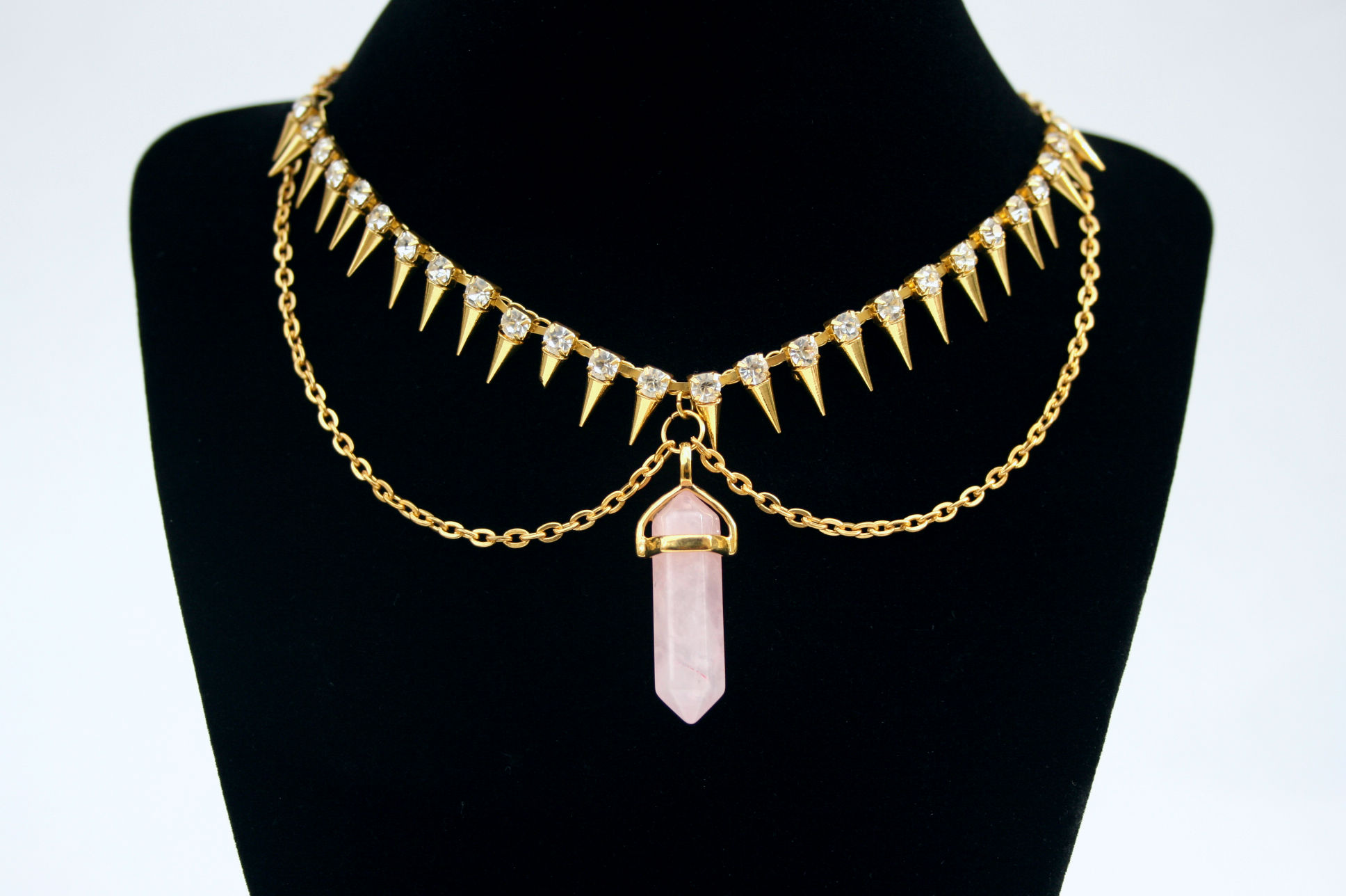 Handmade crystal choker made with a Rose Quartz pendant attached to a gold spiked chain, adorn with Swarovski crystals & a collar chain design♡