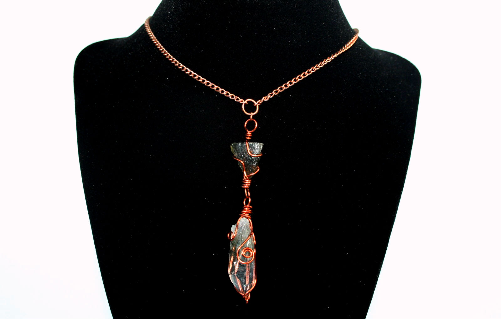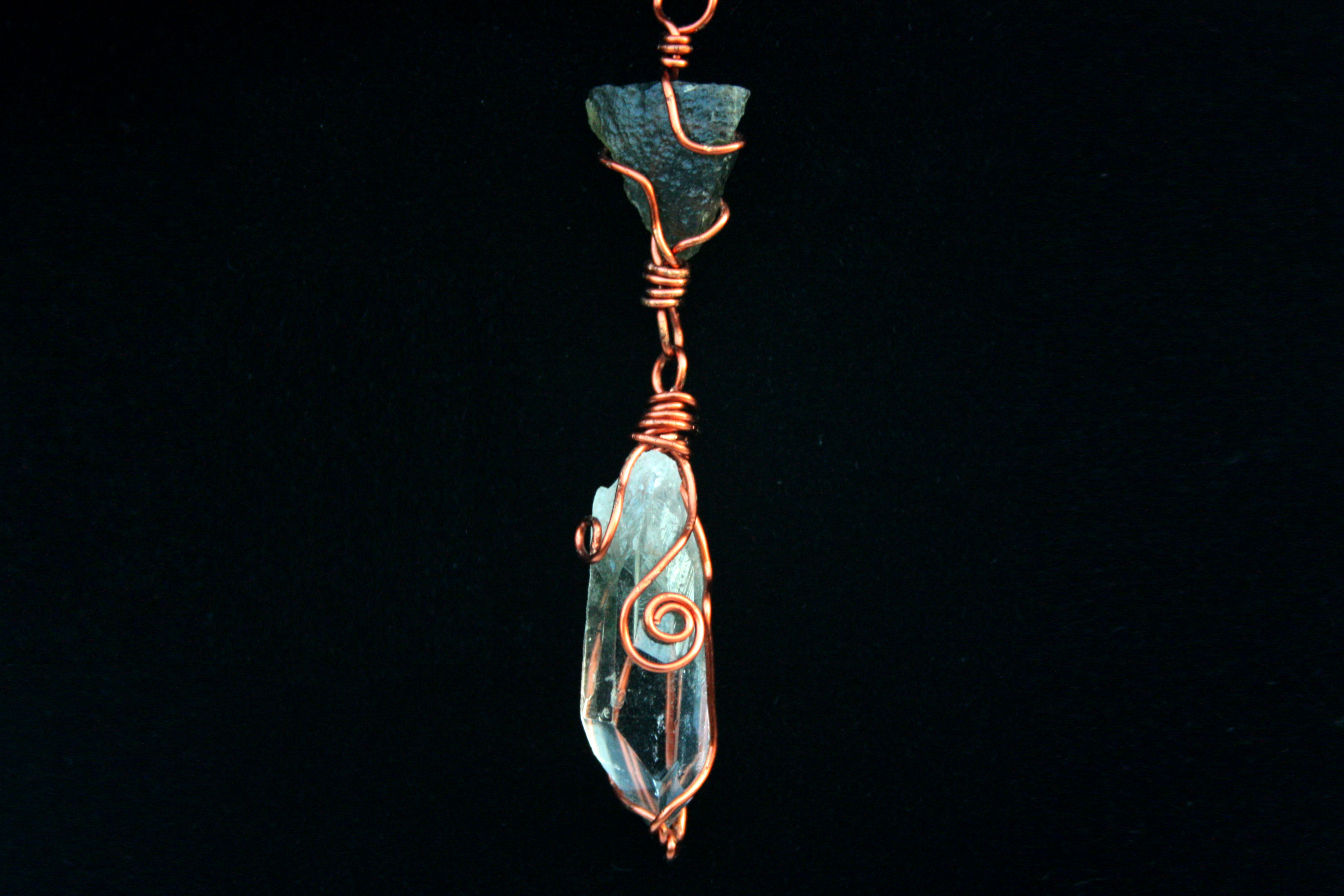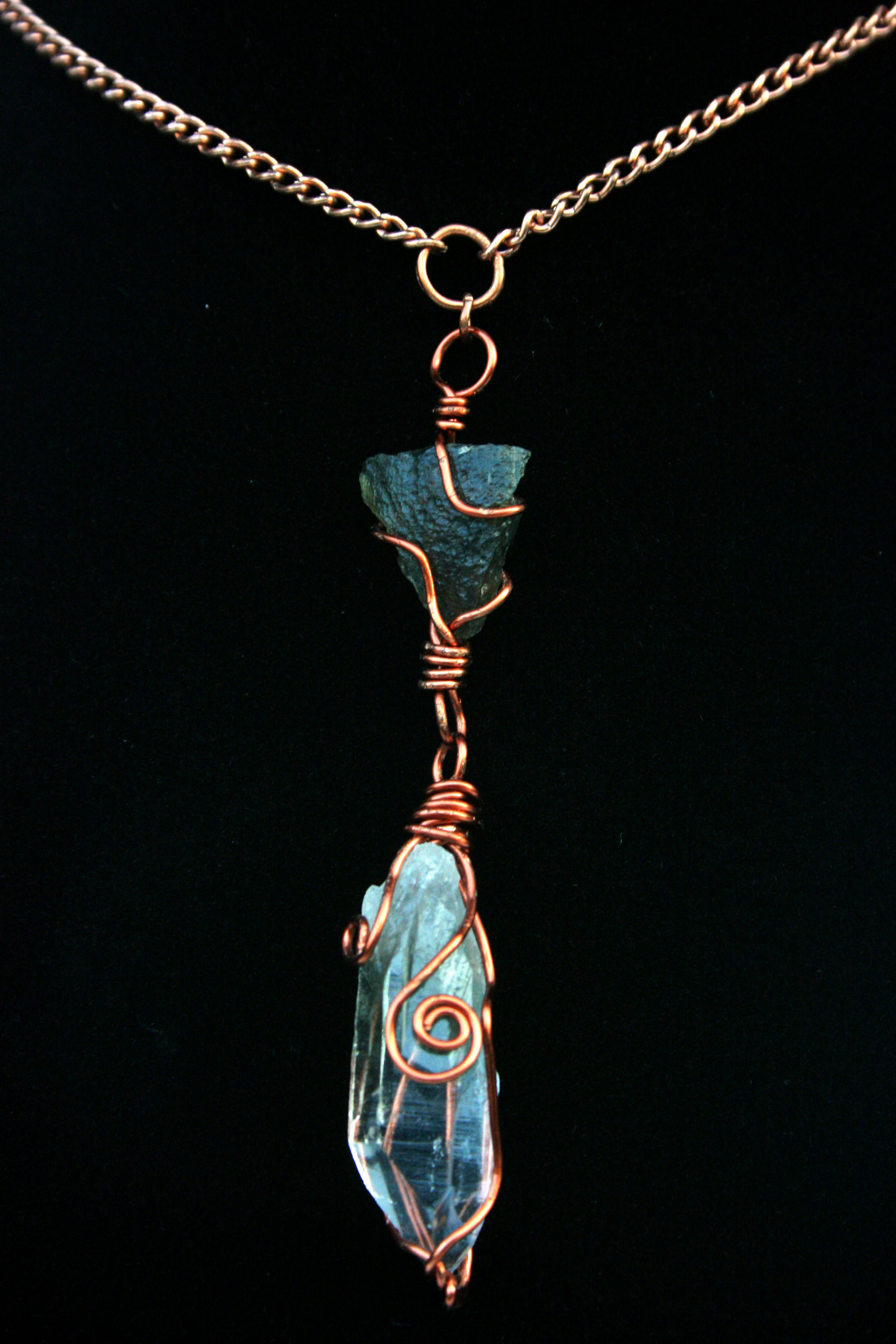 Handmade crystal necklace made with Moldavite linked to a green Chlorite Quartz crystal. All wired up with 100% copper, the best stone energy conductor♡