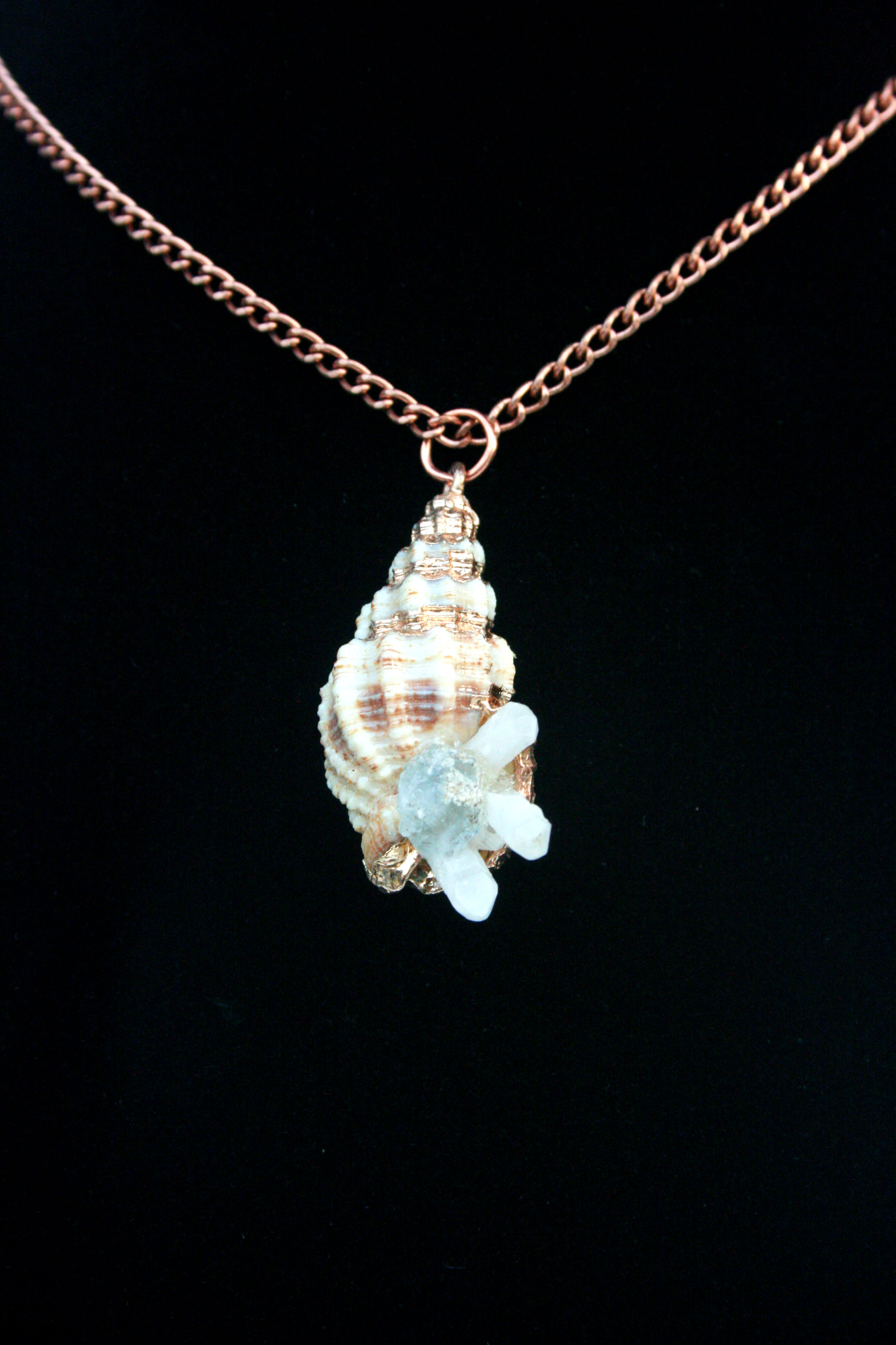 Handmade crystal necklace made with mini Snow Quarts Points & a Calcite Madagascar Crystal protruding out of a gold lined sea shell♡