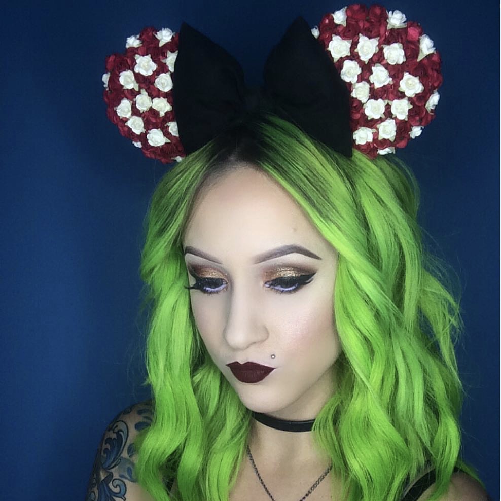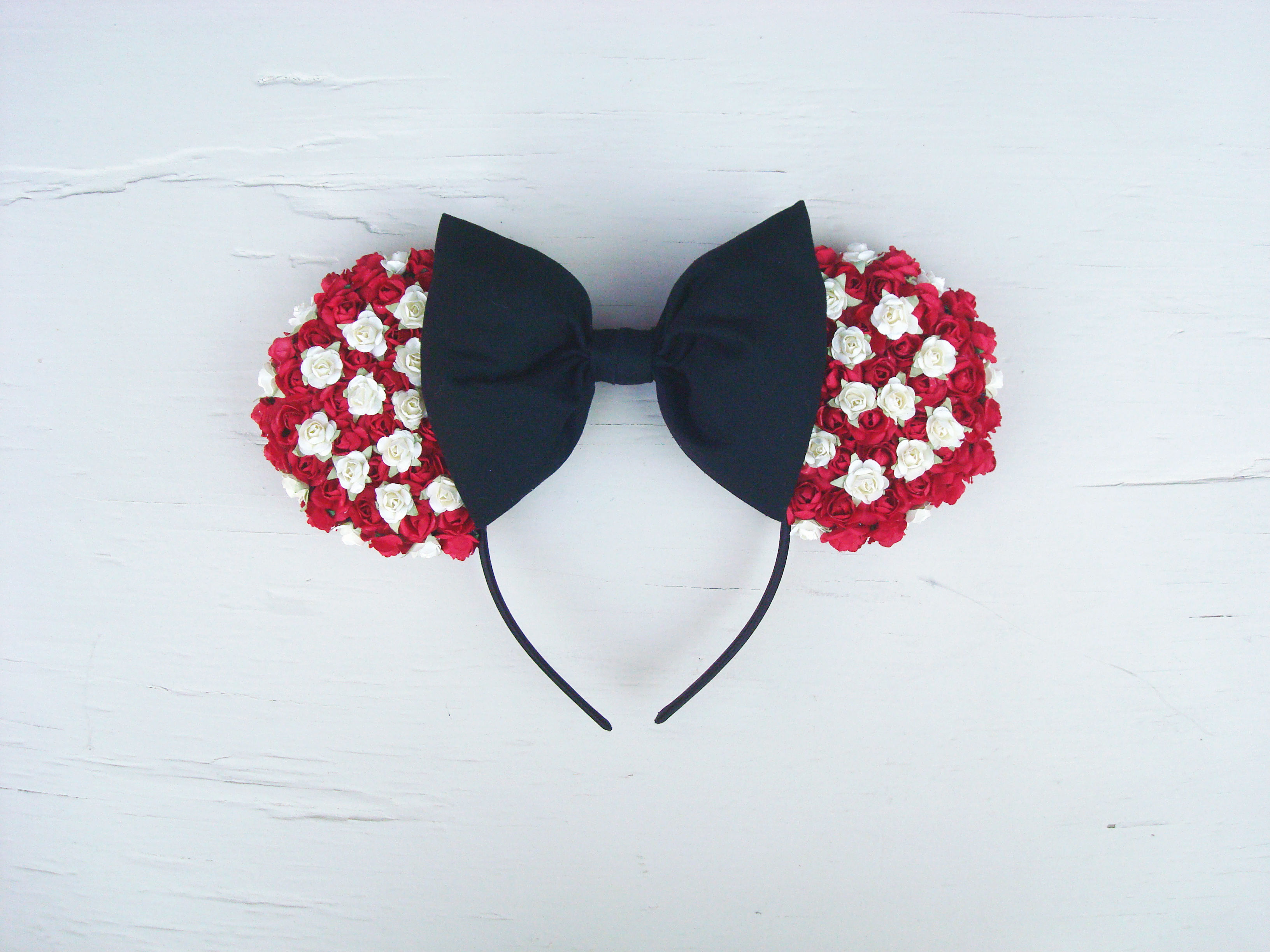 Handmade Minnie Mouse themed floral ears made with cream & red colored rosettes, leaves, & adorn with a lovely black bow♡
