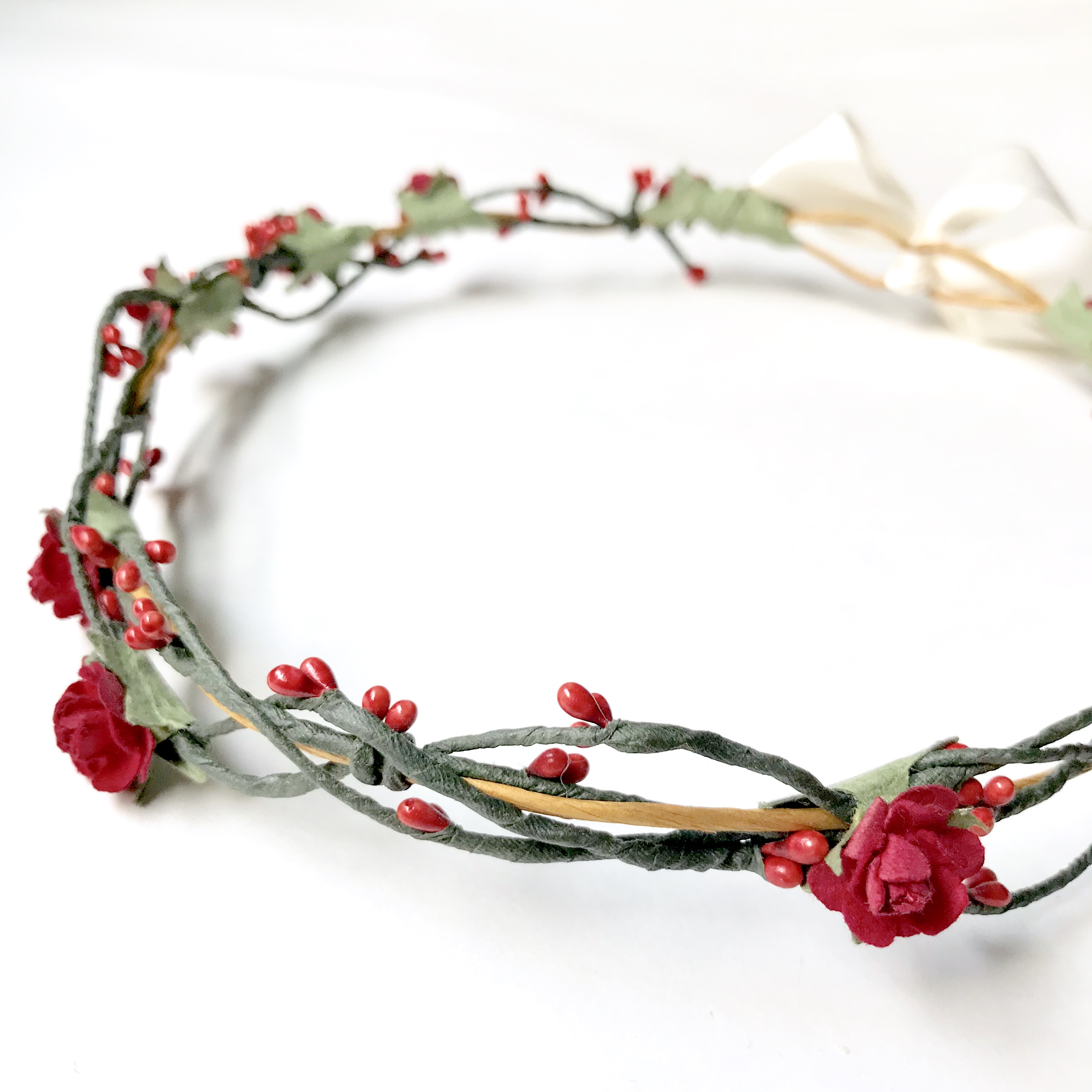 Handmade floral crown made with deep red rosettes, berries, wreaths, leaves, vines & lovely finish detailing♡