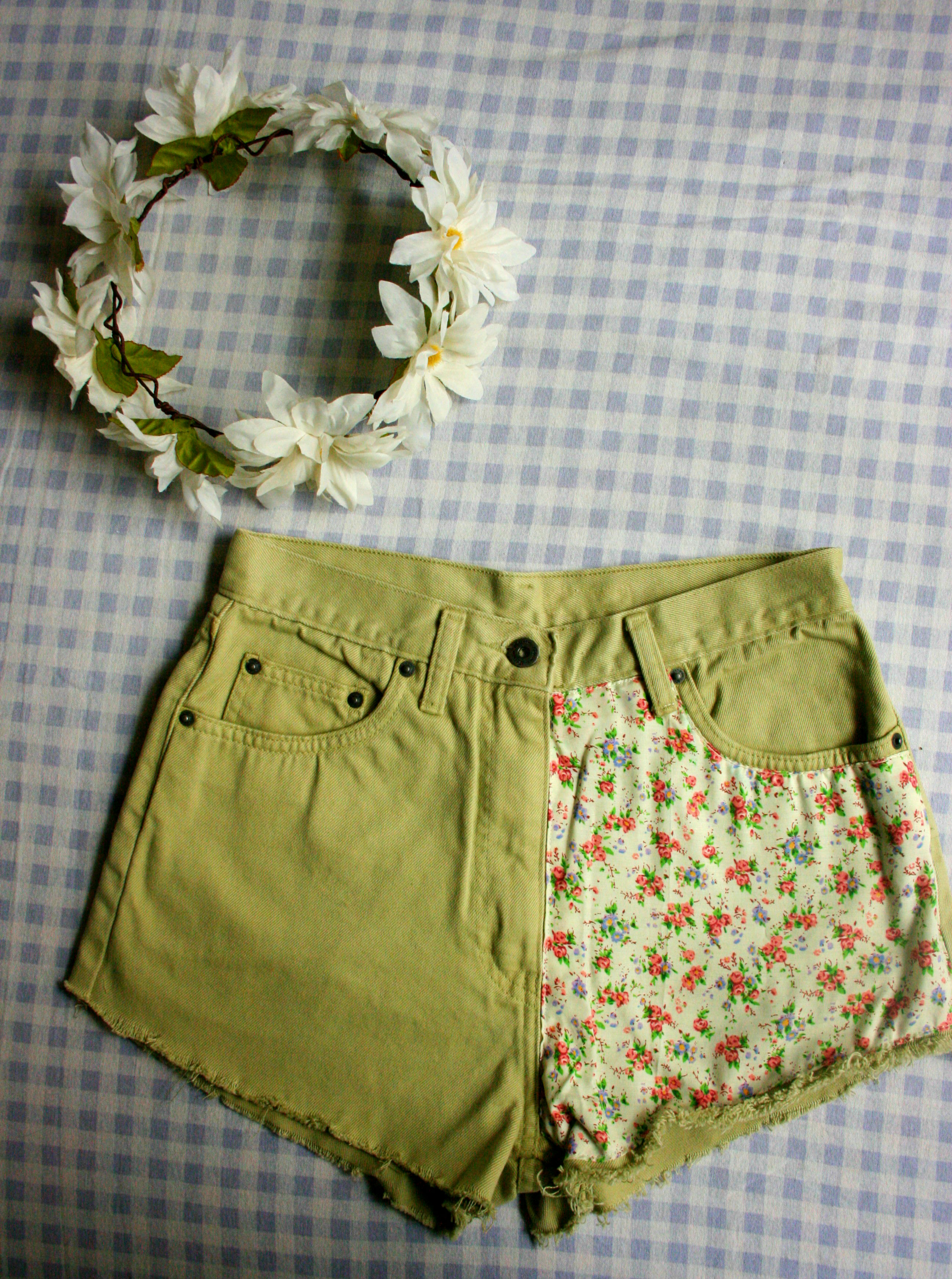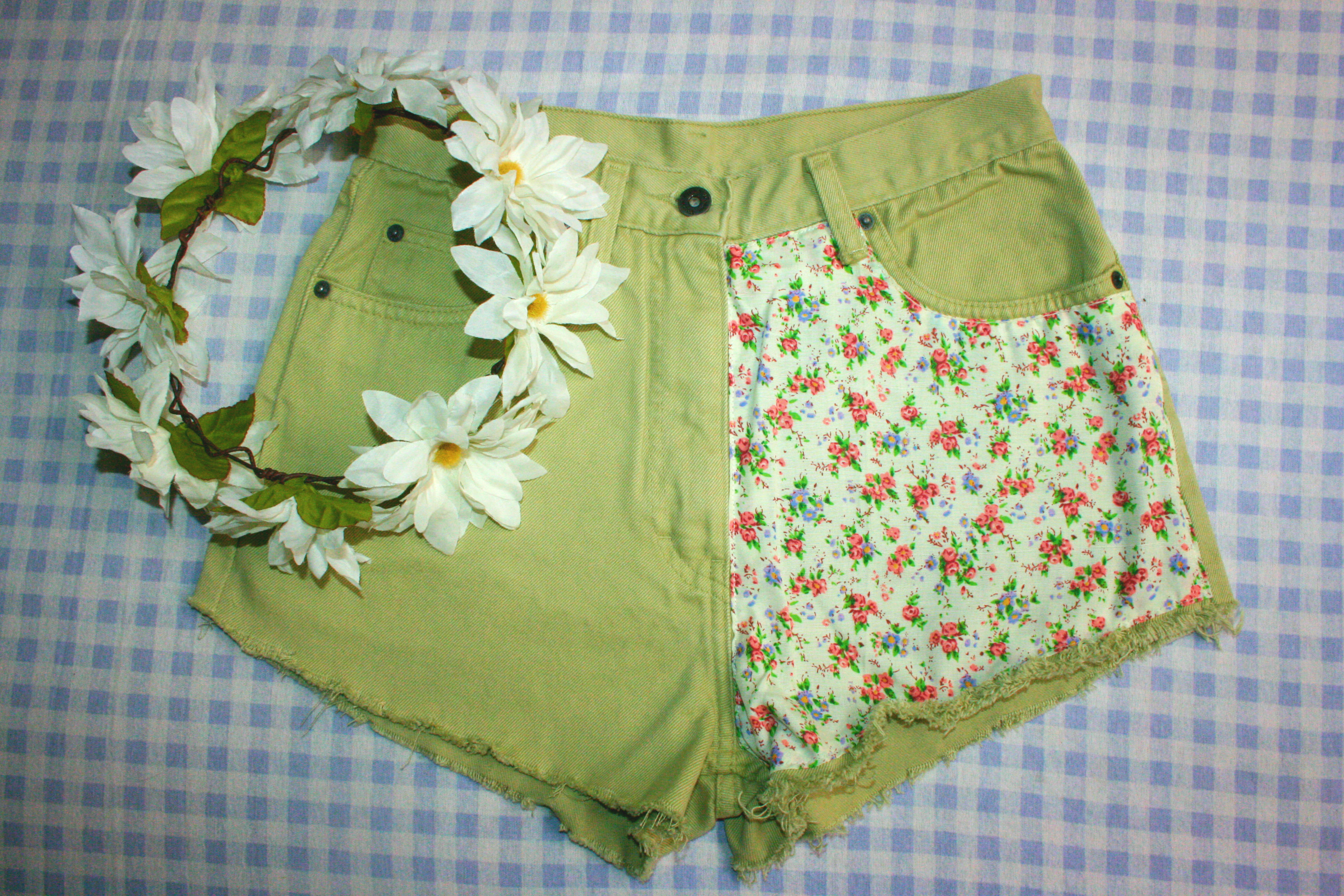 High waisted jeans altered into shorts made with a floral panel sown onto the right side & distressed ends for a lovely finish detailing♡