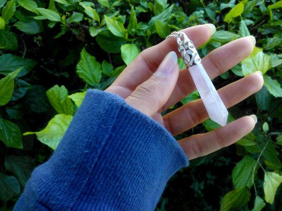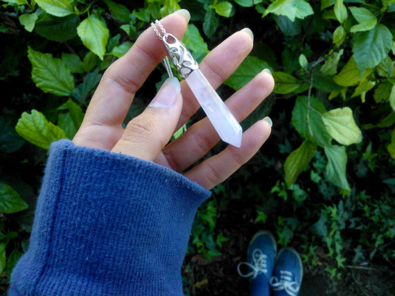 Handmade crystal necklace made with a Rose Quartz point pendant capped off with a silver filigree casing♡